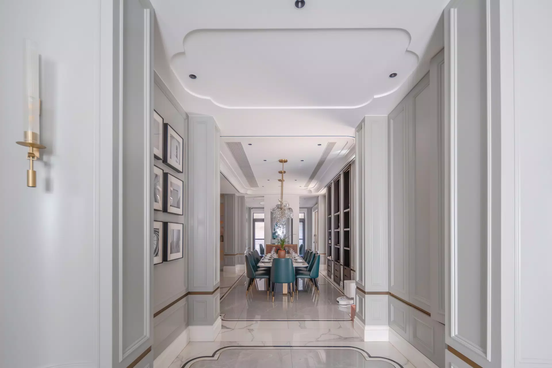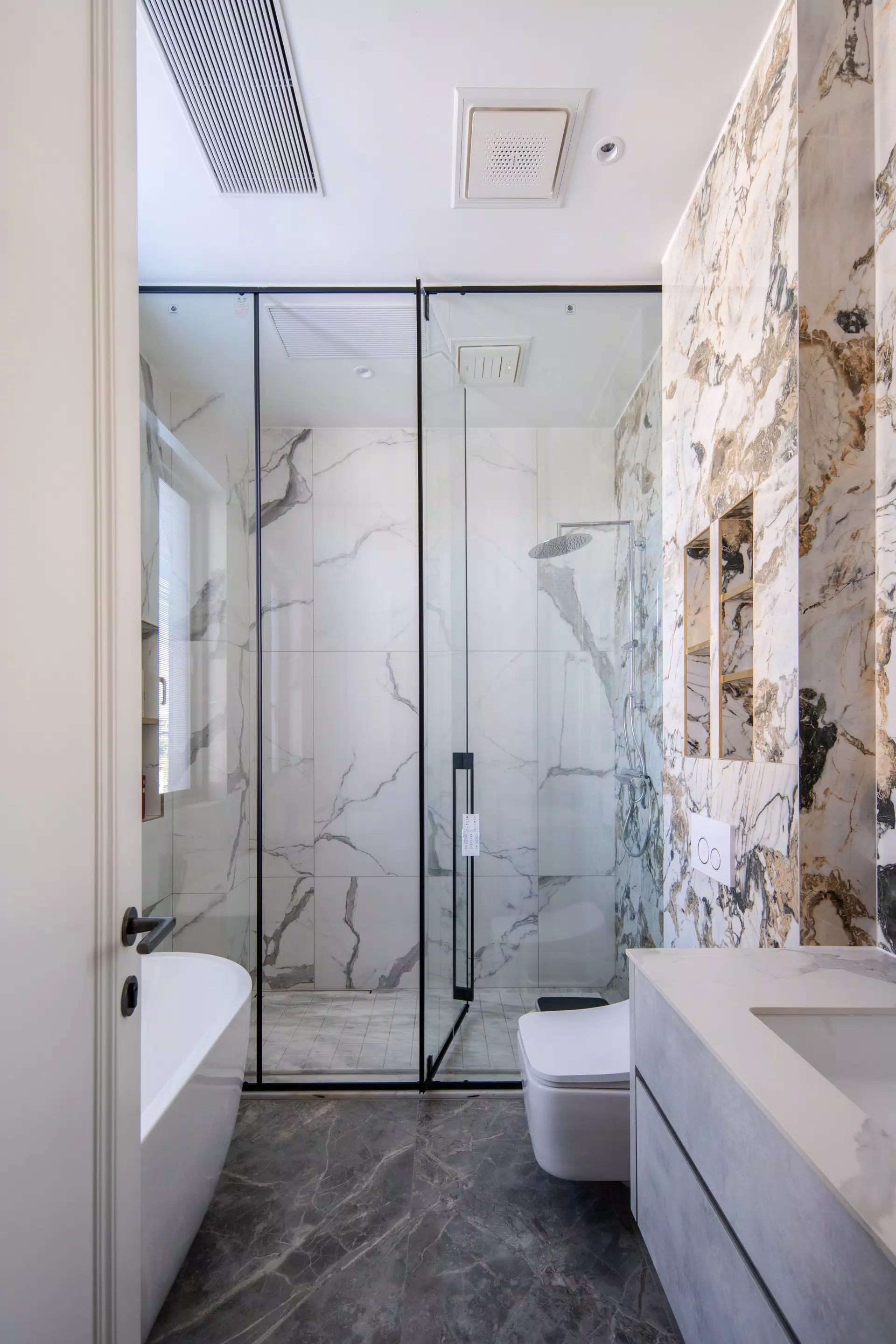 The focal point of the project is the double-height living area, enhanced by large glazed windows and a dramatic suspended chandelier. The flooring, made with I Classici Statuario in a polished finish, amplifies brightness and emphasizes the verticality of the space, while the Timeless Amani Grey Polished insert creates a refined ceramic rug that organizes the living areas with visual continuity. Florim surfaces combine the aesthetic of marble with the strength and the ease of maintenance of porcelain stoneware, ensuring high performance over time.